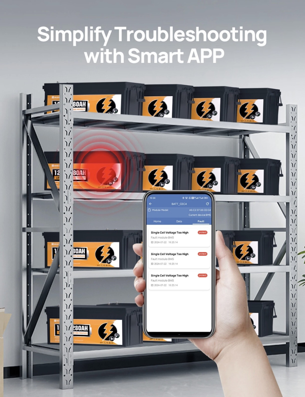 [Monitorizare inteligentă Bluetooth 5.1] – Verificare în timp real a datelor bateriei, inclusiv SOC, tensiune, temperatură, cicluri de viață și stare prin intermediul smartphone-ului. Păstrați întotdeauna controlul asupra sistemului de alimentare.